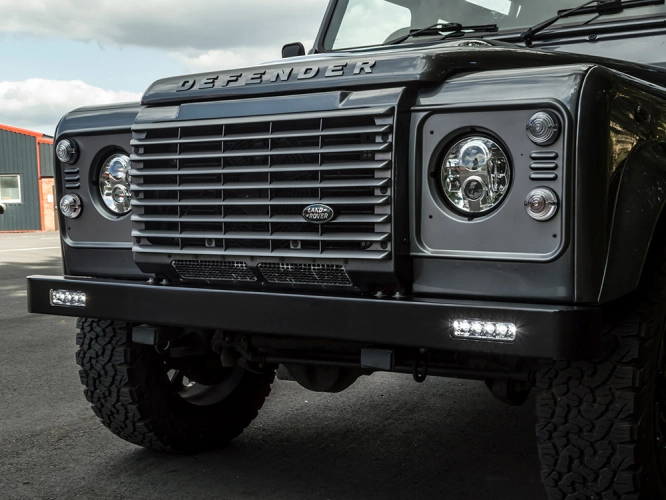 This smart and functional standard fit Defender bumper is equipped with a pair of LED lights for additional lighting in the dark or day light running for safety.